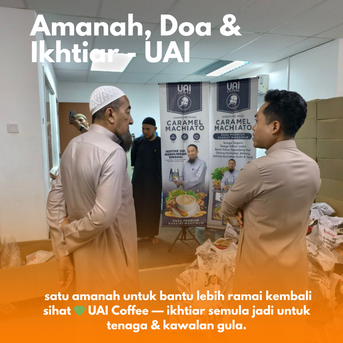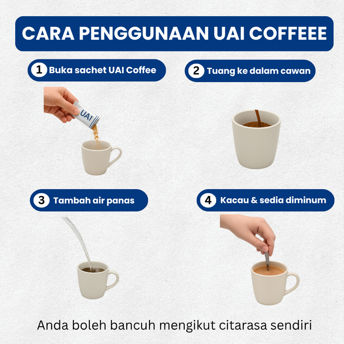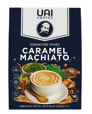UAI Coffee dibuat daripada bahan aktif seperti Moringa, Sacha Inchi, dan White Tiger Mushroom, yang bantu kawal tenaga, gula, dan saraf secara semula jadi.