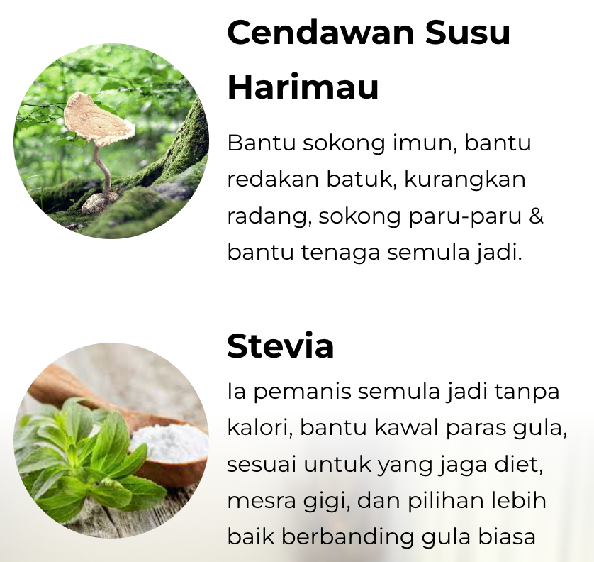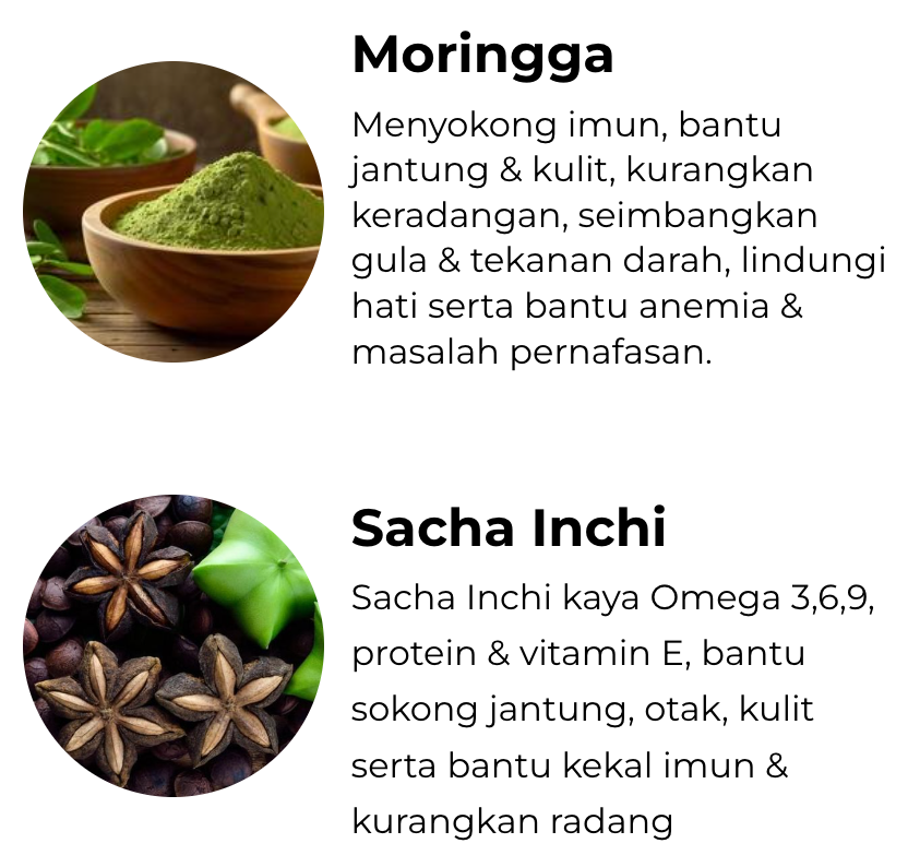 Bahan-bahan seperti Moringa dan Sacha Inchi juga diiktiraf tinggi antioksidan,